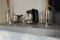 Микроволновая печь, электрическая плита (две конфорки), вытяжка, холодильник, электрический чайник, заварной чайник, турка, капельная кофеварка, посуда (чашки, стаканы, бокалы, рюмки, тарелки, кастрюли, сковородка, столовые приборы).