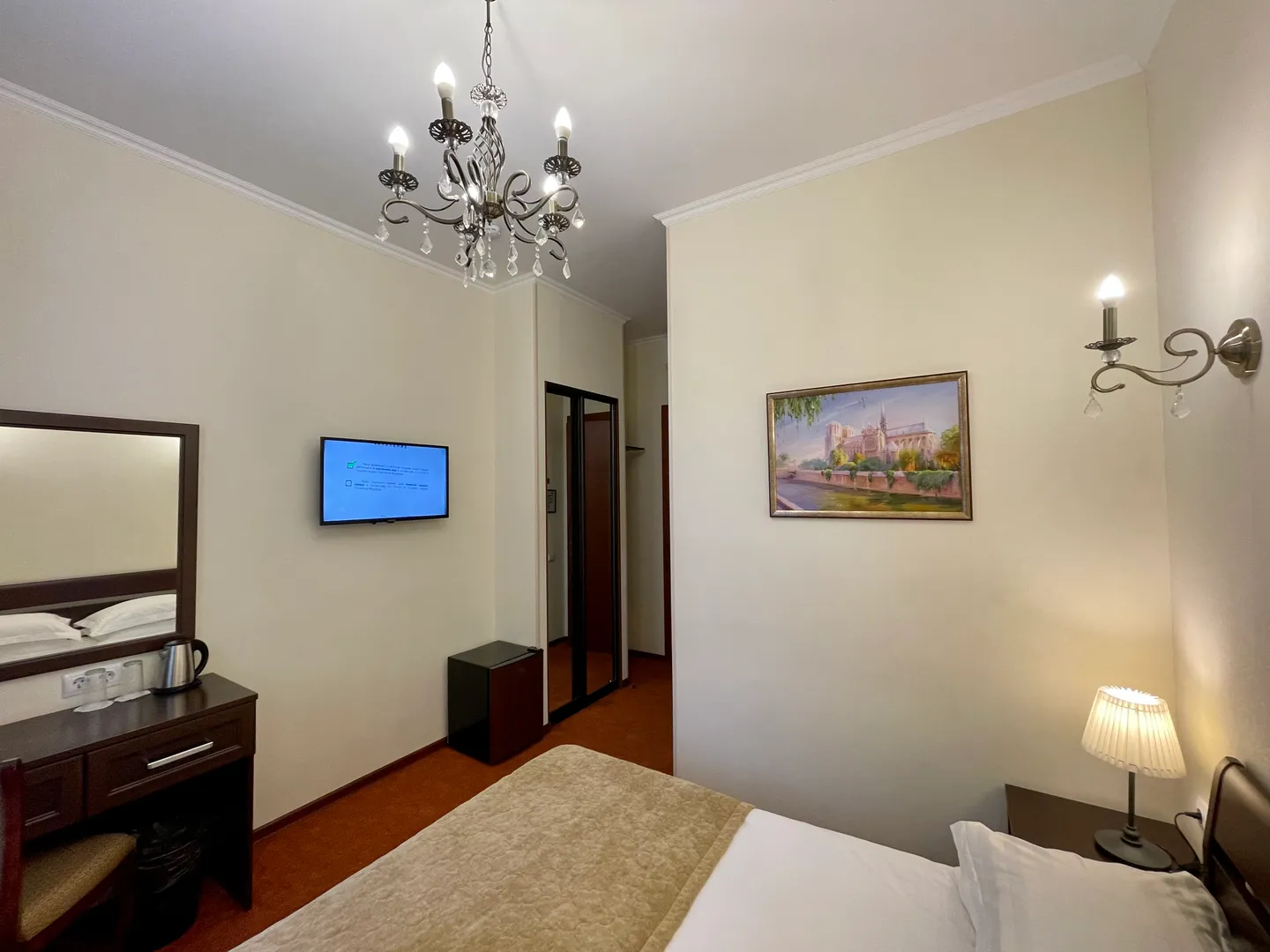 Кровать стоит впритык к окну (не очень удобно), на 4 этаж подниматься после прогулок тяжеловато, но не критично, при бронировании не понятно было какой этаж будет,