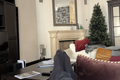 - Мягкая зона с 4K-телевизором, PS5, саундбаром в уютной гостиной с камином.