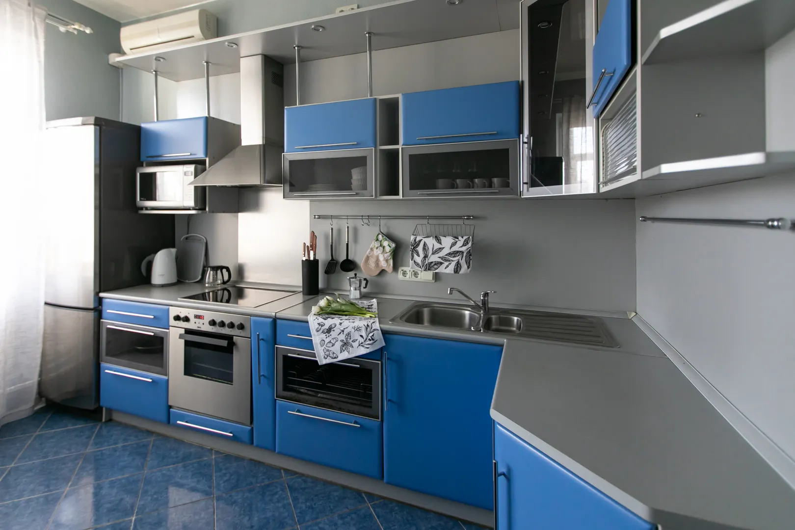 + Микроволновая печь, фен, электрический чайник, холодильник, электрическая плита с духовым шкафом, утюг с гладильной доской, стиральная машина.