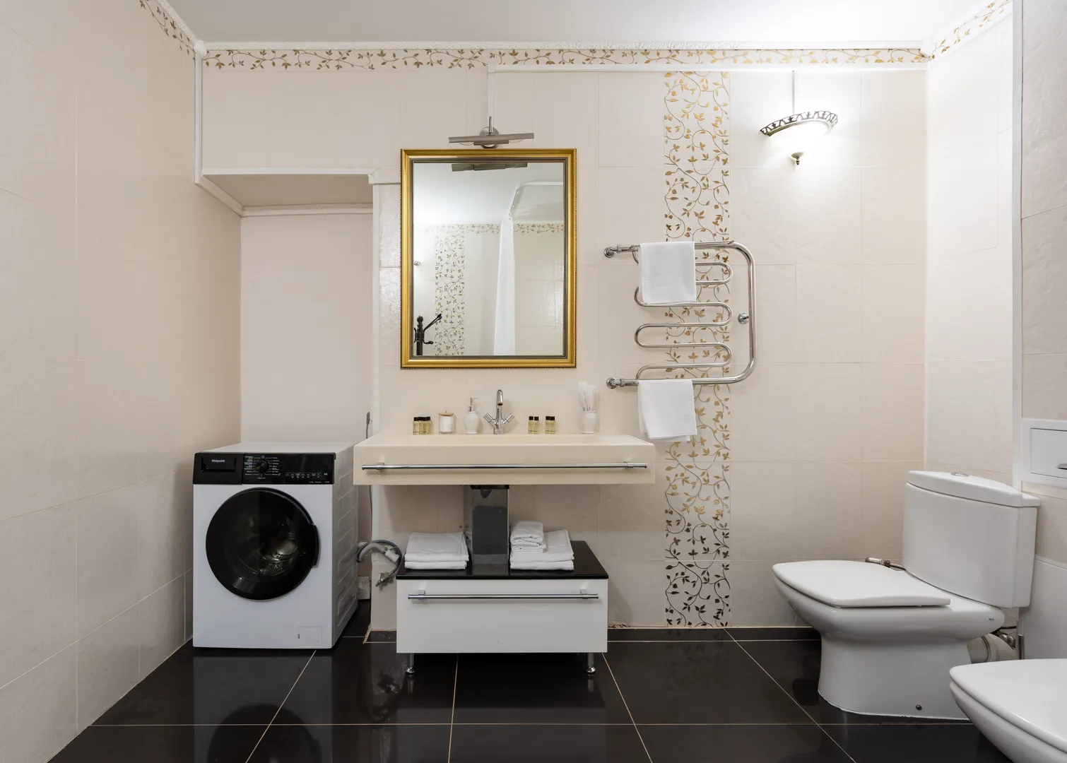 В ванной есть стиральная машина, фен, гигиенические принадлежности, тапочки, полотенца.