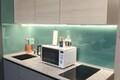 В зоне кухни располагается встроенный двухкамерный холодильник, индукционная варочная панель, посуда (сковорода, кастрюли, тарелки, миски, кружки, стаканы, бокалы, столовые приборы) посудомоечная машина, средство для посудомоечной, машины, встроенная вытяжка, микроволновая печь, смеситель 2 в 1 с фильтром для питьевой воды.