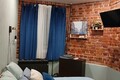 В этой уютной комнате с общим сан узлом гостей встречает гармоничная атмосфера, создаваемая стильным сочетанием кирпичной кладки и нежных оттенков стен. Центральное место в интерьере занимает удобная кровать, дополненная мягким пледом и подушками спокойных оттенков, приглашающими к полноценному отдыху. Оригинальные акценты добавляют синие шторы и стильный декор в виде фотографий и растений, создавая ощущение домашнего уюта.