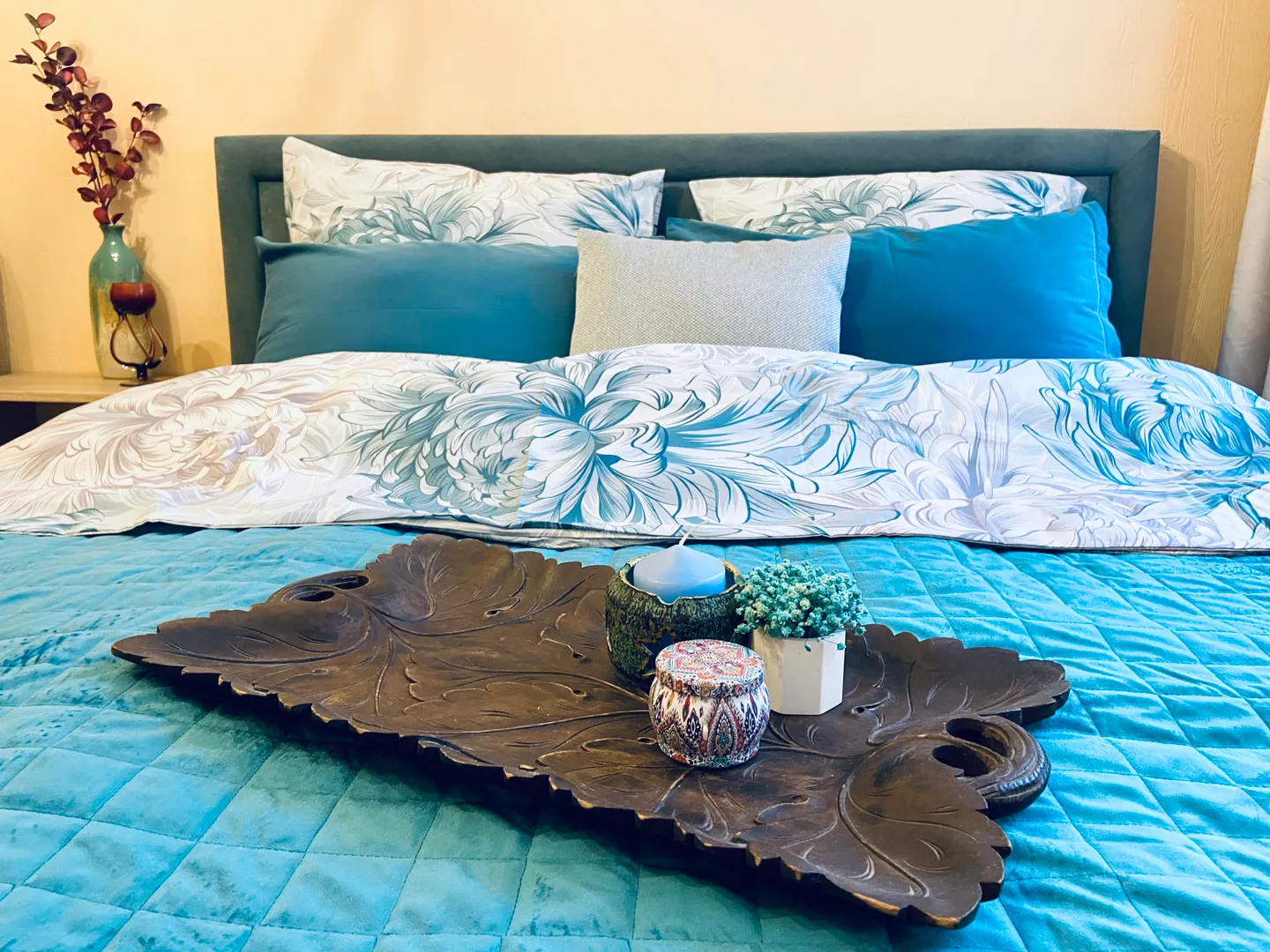 Выполнен ремонт в классическом стиле в приятных обволакивающих тёплых цветах с бирюзовыми и синими акцентами.