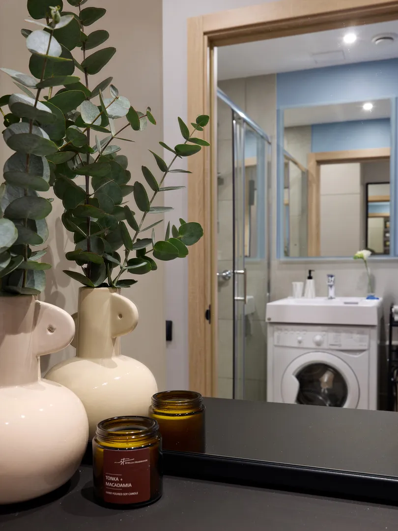 Квартира оснащена вместительной зоной хранения, стиральной машиной, феном, гладильной доской, сушилкой и утюгом.