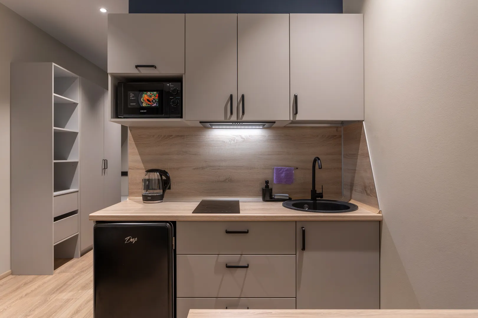 Полностью оборудованная кухня с варочной панелью, вытяжкой, чайником, микроволновой печью и холодильником;