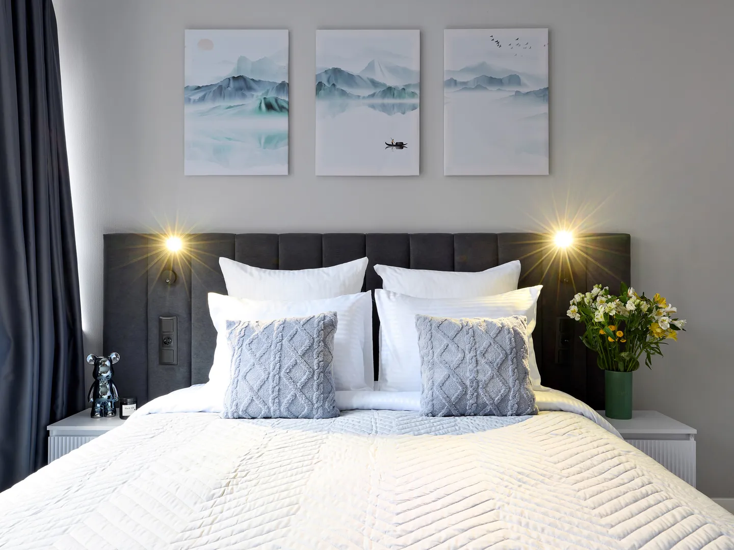 Мебель: кровать с ортопедическим матрасом 160х200, вместительный шкаф для ваших вещей, совмещенная рабочая и обеденная зона с видом на панораму города, удобства для приготовления еды в номере. Каждому гостю выдается постельное бельё и полотенца. Шторы блэк-аут гарантируют вам крепкий и спокойный сон в период белых ночей.