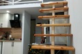 На втором уровне - большая постель с ортопедическим матрасом, внизу расположен санузел, гостиная и кухня. В гостиной есть телевизор, удобный диванчик с яркими декоративными подушками и столик.