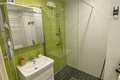В ванной комнате душевая в скандинавском стиле, туалетные принадлежности, стиральная машина, сушилка, махровые полотенца, фен и чистящие средства.