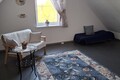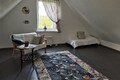 1) по лестнице - в мансардный этаж, где расположена спальня (двуспальная кровать, раскладушка для ребенка-дошкольника, журнальный столик и банкетка.