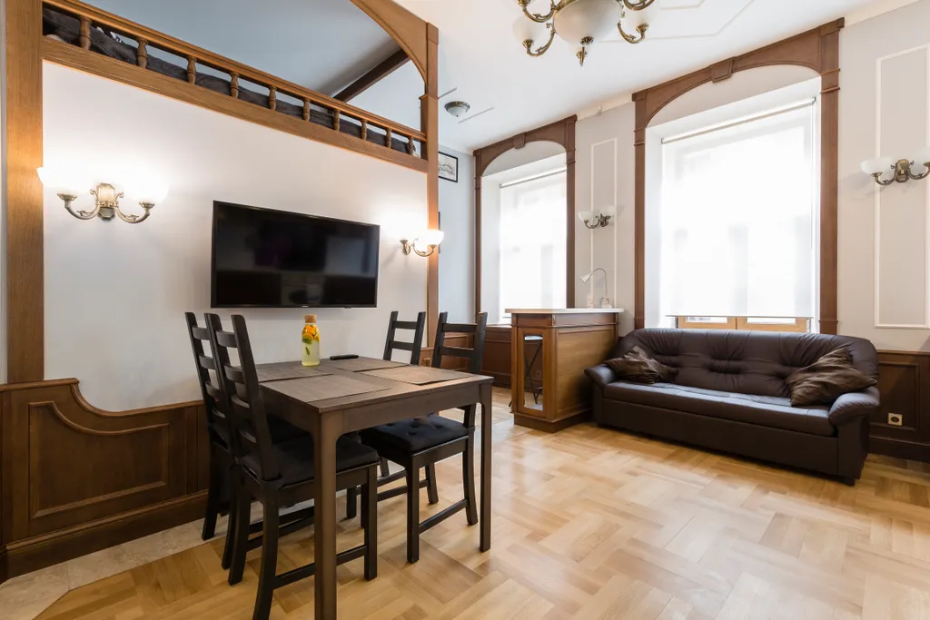 В апартах три студии оснащенных всеми необходимыми удобствами: комфортная двуспальная кровать, кухня-гостиная со всей необходимой техникой и посудой, санузел с душем.