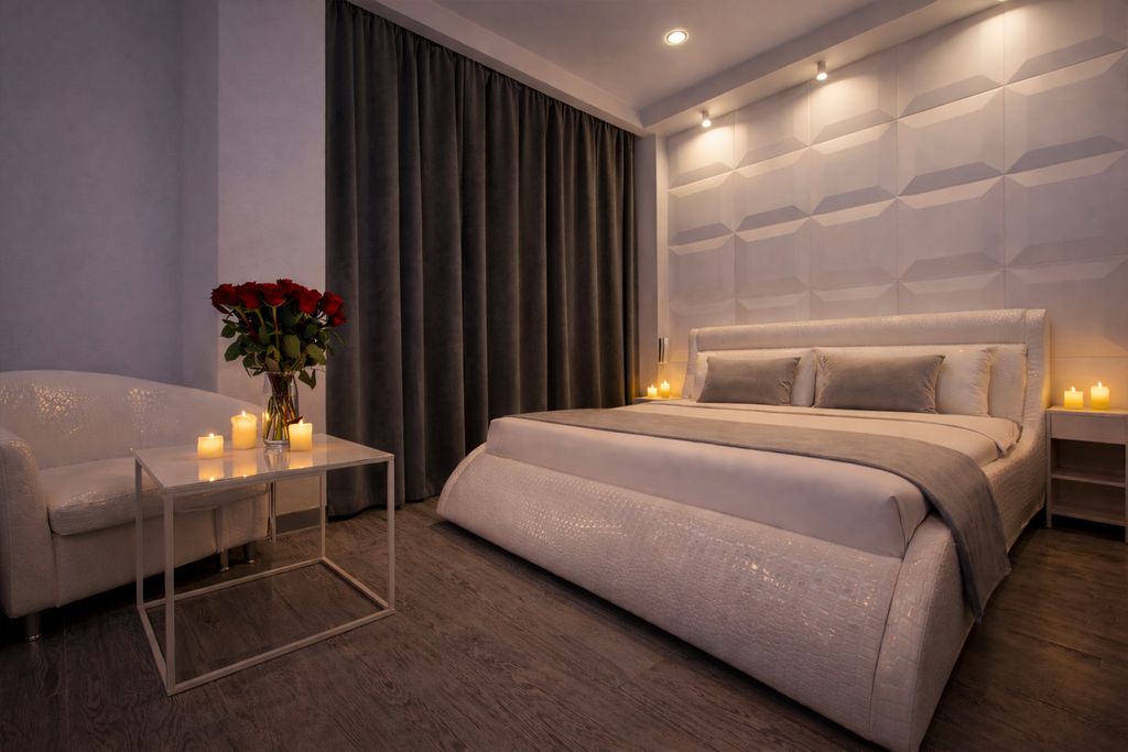 Шикарно всё! Чисто, стильно, такого белоснежное постельное редко встретишь 🔥 Из пожеланий - коврик бы у двери и чтобы окно открывалось! Романтическое свидание с мужем удалось)
