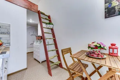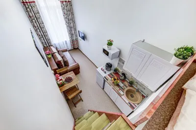 Уютная студия, удобная кровать сверху, хорошая душевая кабинка, положили чай, сахар и самые необходимые мыльные принадлежности