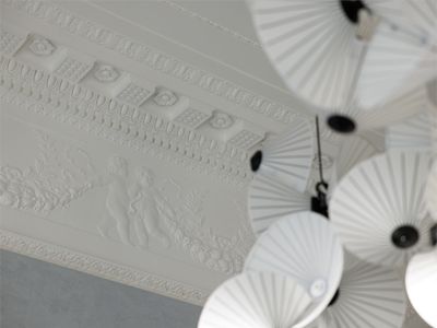 Мы бережно сохранили историческую лепнину и антикварные светильники, интегрировав их в современный дизайн.