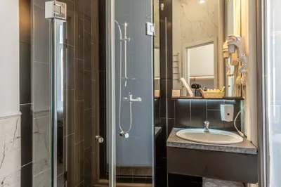Каждый номер оснащен всем необходимым для комфортного проживания: небольшой столик, смарт ТВ, сейф, мини-холодильник, собственная ванная