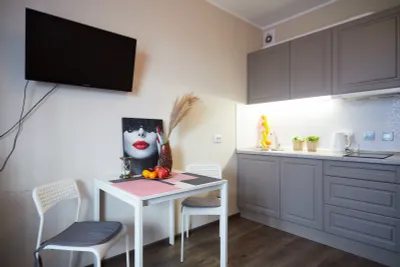 Гостиная и кухня: Smart TV, бесплатный Wi-Fi, обеденный стол, полный кухонный гарнитур (электроплита, холодильник, СВЧ, электрочайник, посуда).
