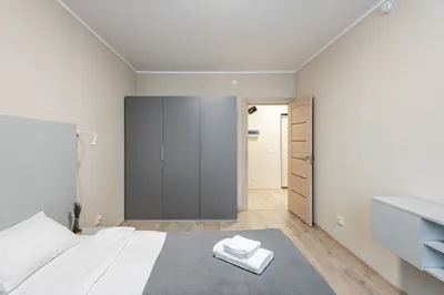 Спальня: большая двуспальная кровать с ортопедическим матрасом, свежее бельё и полотенца, шкаф и комод.