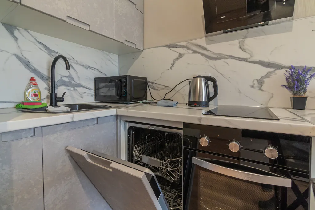 … микроволновка, плита, столовая группа, посуда на 2 персоны, стол со стульями, посудомойка, духовка)